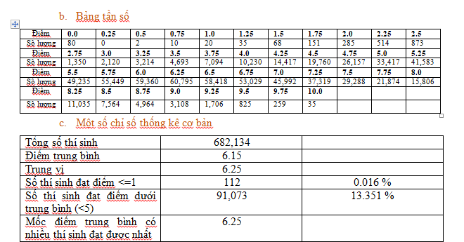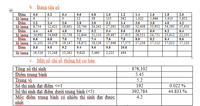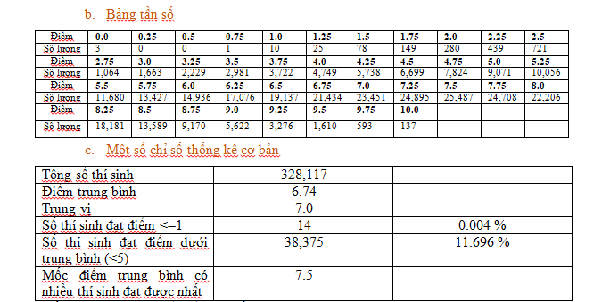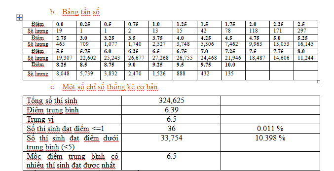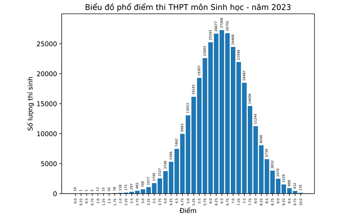 Kết quả phân tích phổ điểm thi tốt nghiệp trung học phổ thông môn Sinh học của cả nước năm 2023 cho thấy: Có 324,625 thí sinh tham gia thi bài thi Sinh học, trong đó điểm trung bình là 6.39 điểm, điểm trung vị là 6.5 điểm; điểm số có nhiều thí sinh đạt nhất là 6.5 điểm. Số thí sinh có điểm <= 1 là 36 (chiếm tỷ lệ 0.011%); số thí sinh đạt điểm dưới trung bình là 33,754 (chiếm tỷ lệ 10.4%).