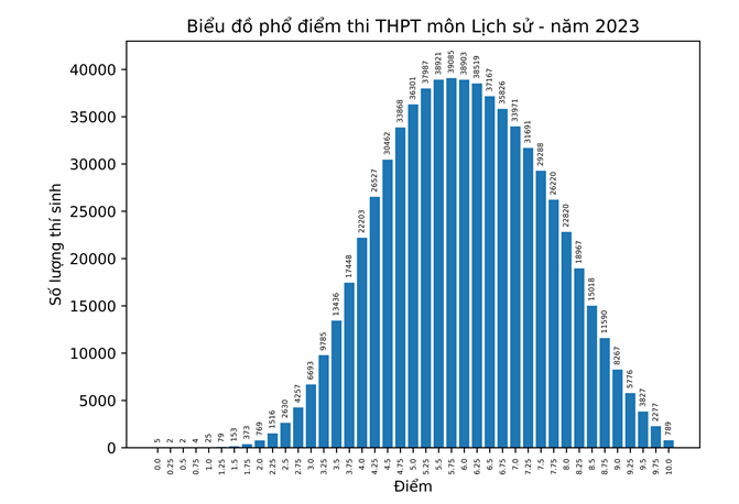 Kết quả phân tích phổ điểm thi tốt nghiệp môn Lịch sử của cả nước năm 2023 cho thấy: Có 683,447 thí sinh tham gia thi bài thi Lịch sử, trong đó điểm trung bình là 6.03 điểm, điểm trung vị là 6.0 điểm; điểm số có nhiều thí sinh đạt nhất là 5.75 điểm. Số thí sinh có điểm <= 1 là 38 (chiếm tỷ lệ 0.006%); số thí sinh đạt điểm dưới trung bình là 170,237 (chiếm tỷ lệ 24.91%).