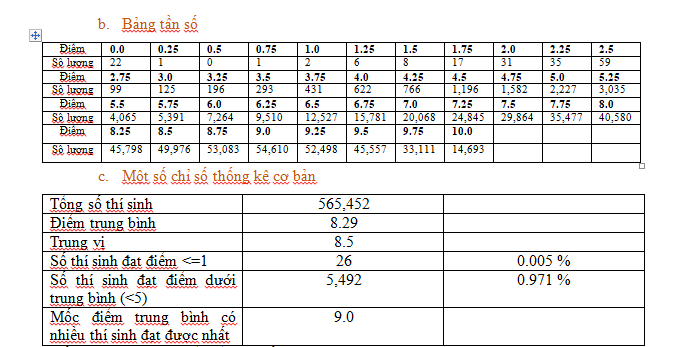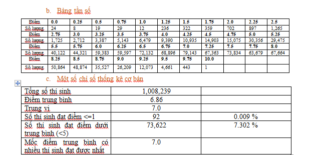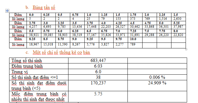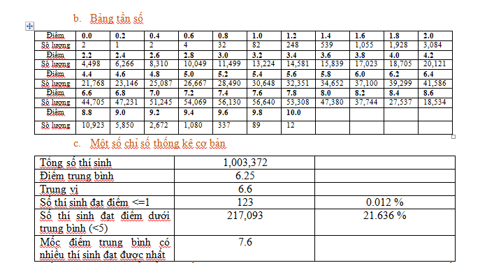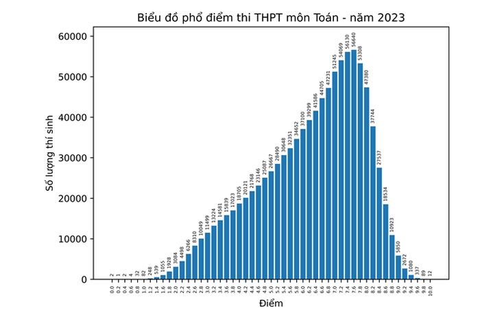 Kết quả phân tích phổ điểm thi tốt nghiệp trung học phổ thông môn Toán của cả nước năm 2023 cho thấy: Có 1,003,372 thí sinh tham gia thi bài thi Toán, trong đó điểm trung bình là 6.25 điểm, điểm trung vị là 6.6 điểm; điểm số có nhiều thí sinh đạt nhất là 7.6 điểm. Số thí sinh có điểm <= 1 là 123 (chiếm tỷ lệ 0.012%); số thí sinh đạt điểm dưới trung bình là 217,093 (chiếm tỷ lệ 21.64%).