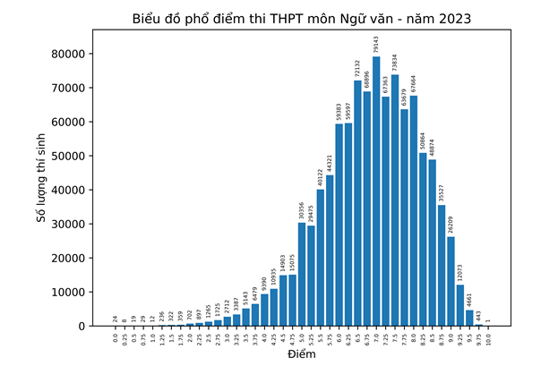 Kết quả phân tích phổ điểm thi tốt nghiệp trung học phổ thông môn Ngữ văn của cả nước năm 2023 cho thấy: Có 1,008,239 thí sinh tham gia thi bài thi Ngữ văn, trong đó điểm trung bình là 6.86 điểm, điểm trung vị là 7.0 điểm; điểm số có nhiều thí sinh đạt nhất là 7.0 điểm. Số thí sinh có điểm <= 1 là 92 (chiếm tỷ lệ 0.009%); số thí sinh đạt điểm dưới trung bình là 73,622 (chiếm tỷ lệ 7.3%).