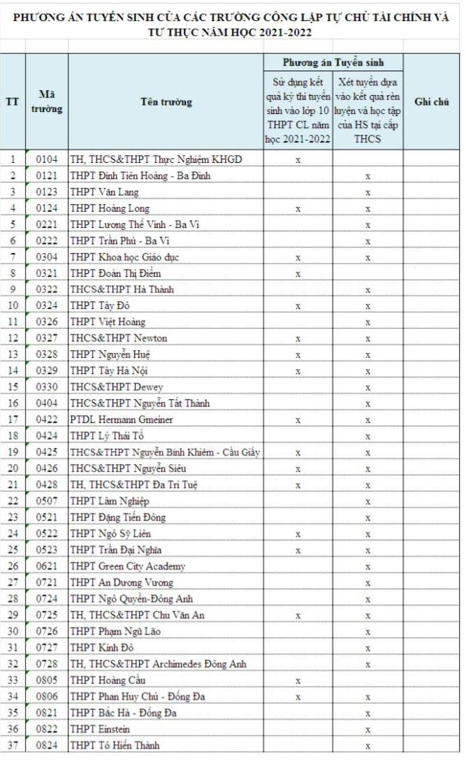 | Phương thức tuyển sinh của 111 trường trung học phổ thông tự chủ tài chính, tư thục trên địa bàn Hà Nội (ảnh chụp màn hình) |