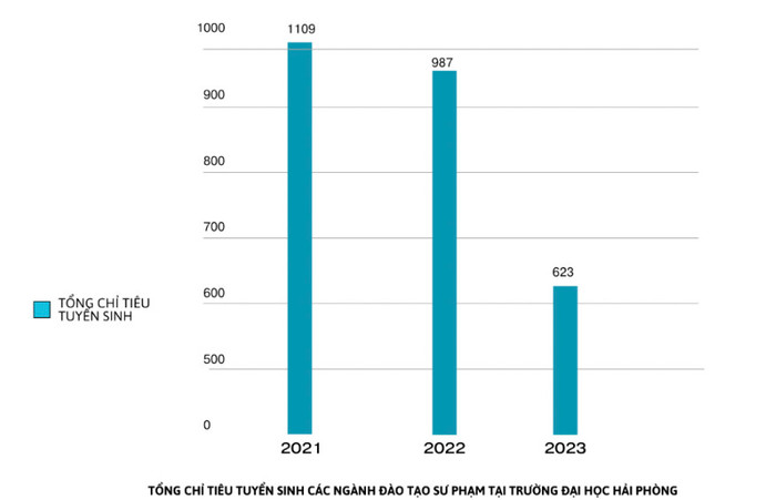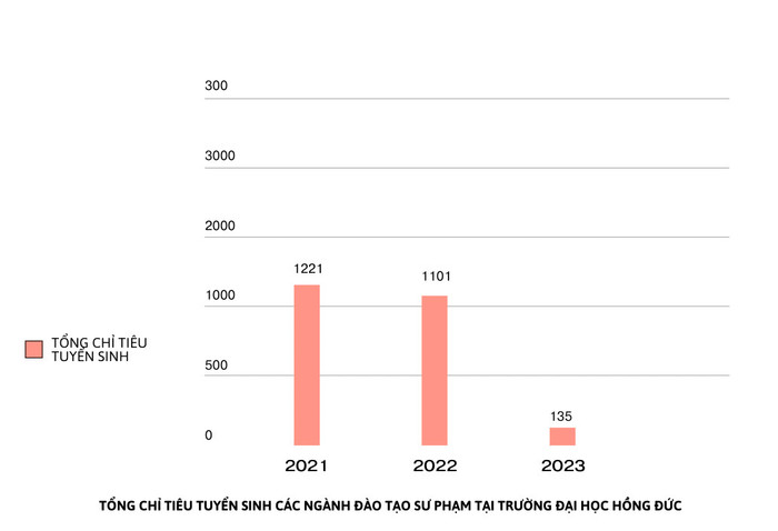 Từ năm 2021 đến 2022, chỉ tiêu của ngành Giáo dục Mầm non giảm từ 85 xuống còn 38; ngành Giáo dục Tiểu học giảm gần 50%, từ 125 xuống 63 chỉ tiêu; ngành Sư phạm Toán giảm từ 32 chỉ tiêu còn 18 và Sư phạm Ngữ văn cũng không ngoại lệ khi giảm từ 33 xuống còn 18 chỉ tiêu.