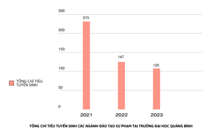 Với Trường Đại học Quảng Bình, theo đề án tuyển sinh 2023, tổng chỉ tiêu của trường là 275 sinh viên đối với các ngành đào tạo sư phạm (ở năm 2021). Tuy nhiên, tổng chỉ tiêu cho các ngành sư phạm đều có xu hướng giảm trong các năm học tiếp theo. Cụ thể năm 2022, trường còn 147 chỉ tiêu. Năm 2023, trường giảm còn 125 chỉ tiêu, giảm hơn 50% chỉ tiêu so với năm học 2021.