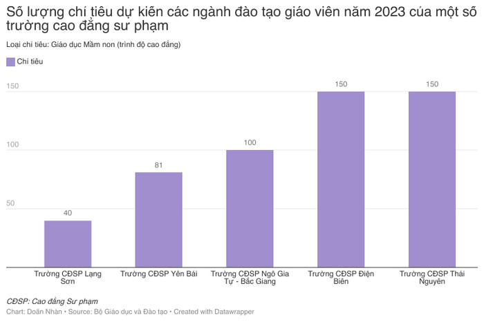 Theo thông báo, đến nay đã có 5 trường cao đẳng sư phạm và 1 trường đại học được giao chỉ tiêu các ngành đào tạo giáo viên. Cụ thể gồm các cơ sở giáo dục sau: Trường Đại học Đà Lạt, Trường Cao đẳng Sư phạm Thái Nguyên, Trường Cao đẳng Sư phạm Điện Biên, Trường Cao đẳng Sư phạm Yên Bái, Trường Cao đẳng Sư phạm Lạng Sơn, Trường Cao đẳng Ngô Gia Tự - Bắc Giang.