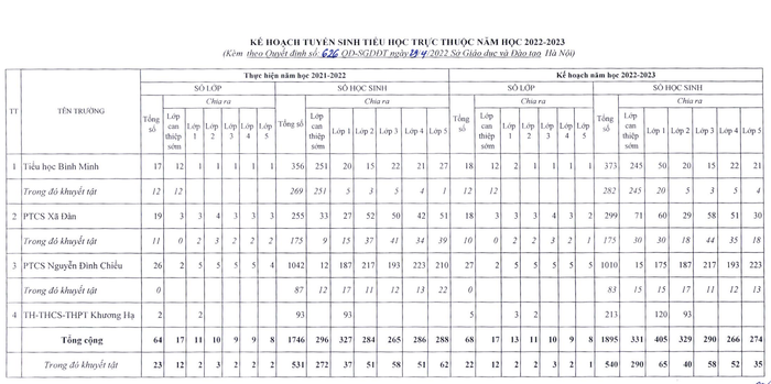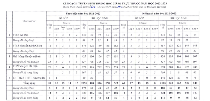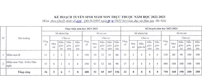 Chỉ tiêu tuyển sinh mầm non, lớp 1, lớp 6 năm học 2022-2023 cho các trường trực thuộc Sở Giáo dục và Đào tạo Hà Nội như sau: