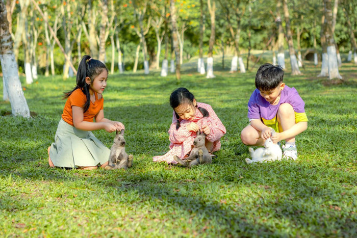 Ngoài đàn công, hàng chục chú thỏ trắng và nâu tung tăng chạy nhảy trong công viên. Các chú thỏ rất thân thiện với trẻ nhỏ. Các em bé tại Ecopark thường mang cà rốt, bắp cải ra cho các đàn thỏ ăn.