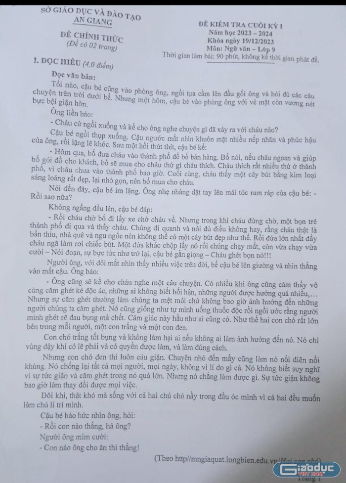 Đề Ngữ văn 9 của Sở Giáo dục và Đào tạo An Giang (Ảnh: L.V.M.)