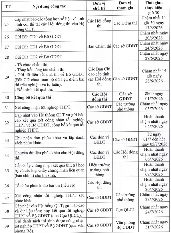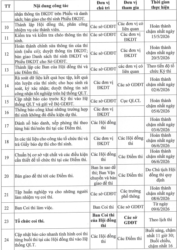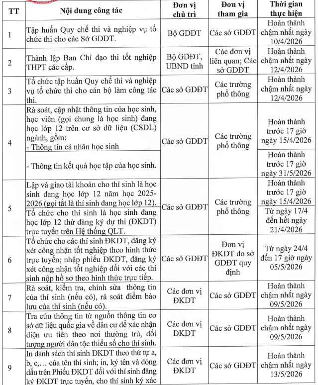 Chi tiết kế hoạch chuẩn bị, tổ chức kỳ thi tốt nghiệp trung học phổ thông 2026 như sau: