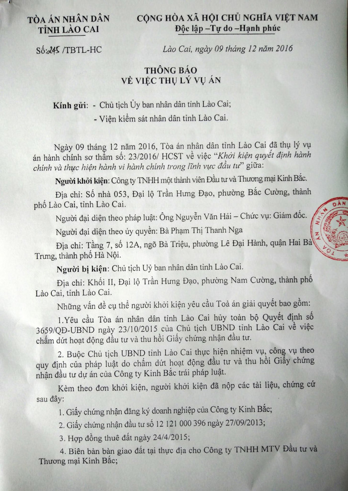 Ngày 09/12/2016 vừa qua, TAND tỉnh Lào Cai đã ban hành 2 thông báo về việc thụ lý vụ án hành chính giữa nguyên đơn là Công ty Kinh Bắc, còn bị đơn là UBND tỉnh Lào Cai và Chủ tịch UBND tỉnh Lào Cai.