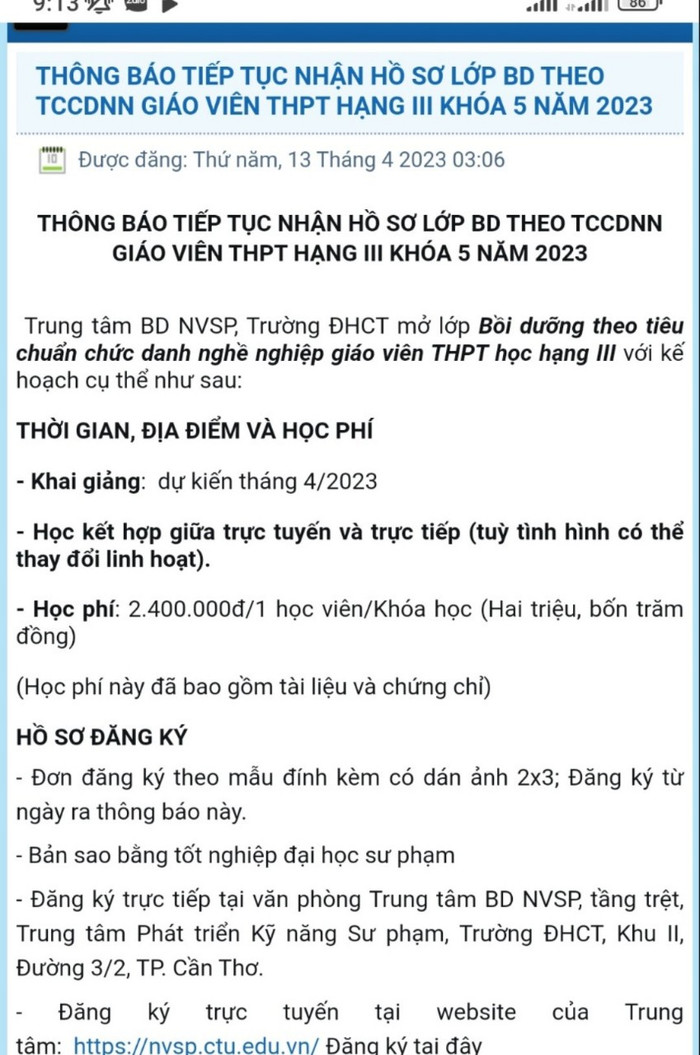 | Đến tháng 4, các cơ sở đào tạo vẫn đăng tuyển chiêu sinh lớp bồi dưỡng chứng chỉ chức danh nghề nghiệp theo hạng. Ảnh chụp màn hình thông báo chiêu sinh. |