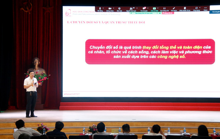 Tại hội thảo, ông Đoàn Hiếu - Giám đốc Trung tâm Đào tạo Bưu chính Viễn thông I (Học viện Công nghệ Bưu chính Viễn thông) trình bày về “Quản trị sự thay đổi trong bối cảnh chuyển đổi số”.