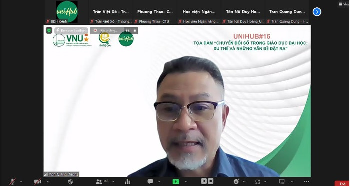 Chia sẻ cùng hơn 200 người tham dự, Tiến sĩ Tôn Quang Cường nhấn mạnh chuyển đổi số trong giáo dục nói chung và giáo dục đại học nói riêng đã được giải quyết ở một số tầng bậc, đã có những định hướng, những chính sách, thậm chí có những hướng dẫn, tuy nhiên khi triển khai vào công việc cụ thể thì vẫn còn rất nhiều những câu hỏi được đặt ra.