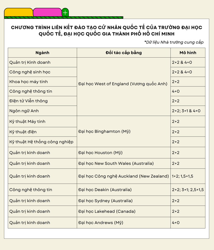 Cử nhân quốc tế liên kết với Đại học West of England (Vương quốc Anh) theo hình thức 2+2; 3+1 và 4+0. Về học phí, giai đoạn 1 học tại Trường Đại học Quốc tế Thành phố Hồ Chí Minh dao động từ 63-67 triệu đồng/ năm; giai đoạn 2 học tại Vương quốc Anh khoảng 490 triệu đồng/ năm (chương trình 2+2 và 3+1).