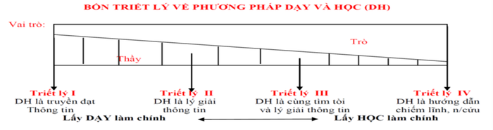 Với sơ đồ này, nhìn từ các bậc học ở Việt Nam, có thể thấy triết lý I chủ yếu dùng cho giáo dục phổ thông, triết lý II chủ yếu cho đào tạo cử nhân, triết lý III cho đào tạo thạc sĩ và triết lý IV cho đào tạo tiến sĩ. Trong thời đại 4.0, nhờ ICT, có sự chuyển dịch: giáo dục phổ thông đã bắt đầu dùng triết lý II, đào tạo đại học bắt đầu dùng triết lý III và đào tạo thạc sĩ dùng cả triết lý IV.