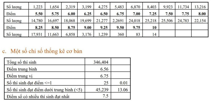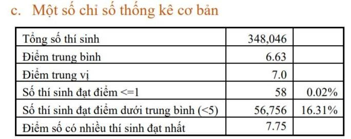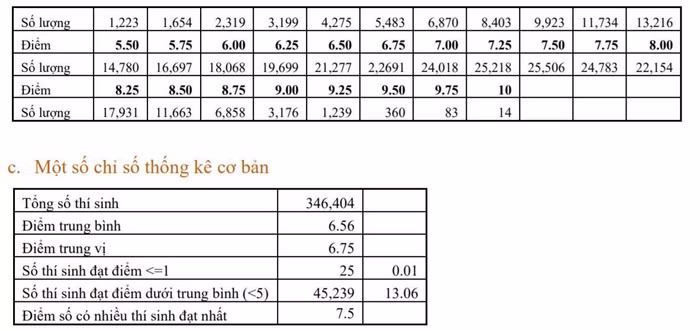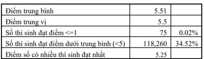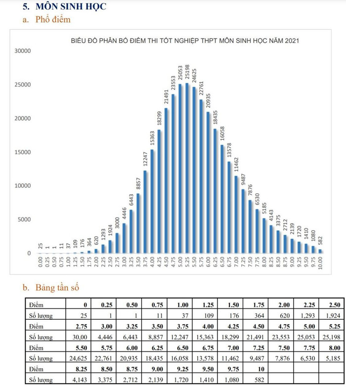 Kết quả phân tích phổ điểm thi tốt nghiệp trung học phổ thông môn Sinh học của cả nước năm 2021 cho thấy: Có 342,604 thí sinh tham gia thi bài thi Sinh học trong đó điểm trung bình là 5.51 điểm, điểm trung vị là 5.5 điểm; điểm số có nhiều thí sinh đạt nhất là 5.25 điểm. Số thí sinh có điểm <= 1 là 75 (chiếm tỷ lệ 0.02%); số thí sinh đạt điểm dưới trung bình là 118,260 (chiếm tỷ lệ 34.52%).