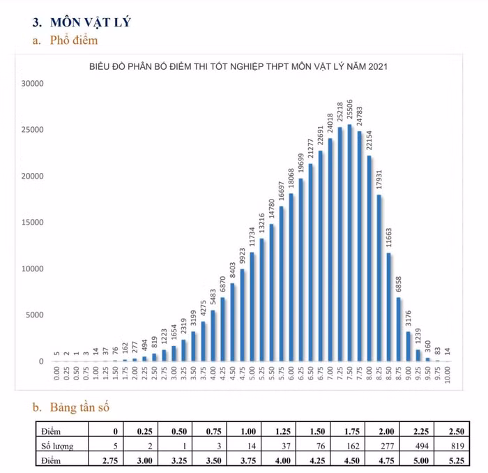 Kết quả phân tích phổ điểm thi tốt nghiệp trung học phổ thông môn Vật lí của cả nước năm 2021 cho thấy: Có 346,404 thí sinh tham gia thi bài thi Vật lí trong đó điểm trung bình là 6.56 điểm, điểm trung vị là 6.75 điểm; điểm số có nhiều thí sinh đạt nhất là 7.5 điểm. Số thí sinh có điểm <= 1 là 25 (chiếm tỷ lệ 0.01%); số thí sinh đạt điểm dưới trung bình là 45,239 (chiếm tỷ lệ 13.06%).