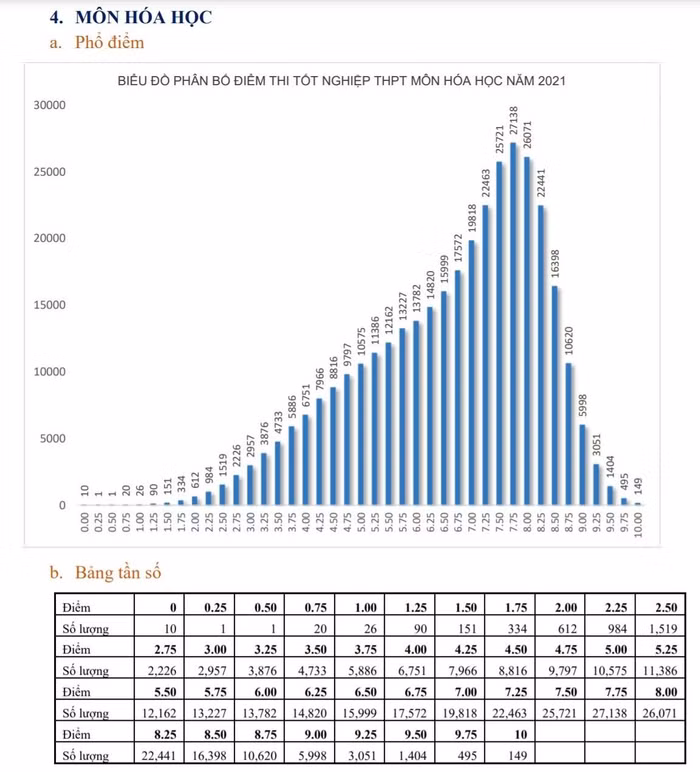 Kết quả phân tích phổ điểm thi tốt nghiệp trung học phổ thông môn Hoá học của cả nước năm 2021 cho thấy: Có 348,046 thí sinh tham gia thi bài thi Hoá học trong đó điểm trung bình là 6.63 điểm, điểm trung vị là 7.0 điểm; điểm số có nhiều thí sinh đạt nhất là 7.75 điểm. Số thí sinh có điểm <= 1 là 58 (chiếm tỷ lệ 0.02%); số thí sinh đạt điểm dưới trung bình là 56,756 (chiếm tỷ lệ 16.31%).