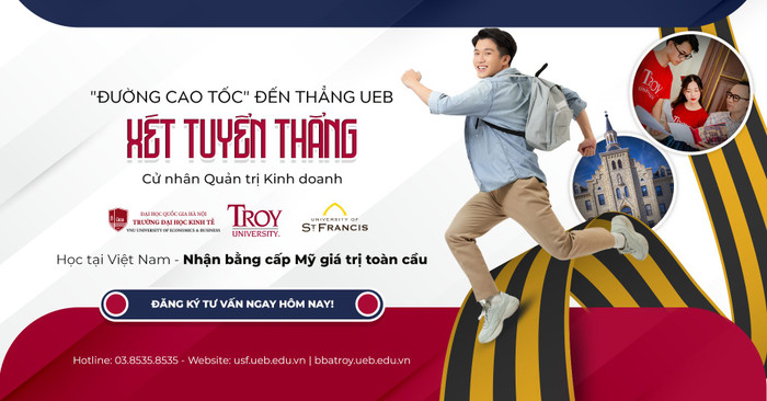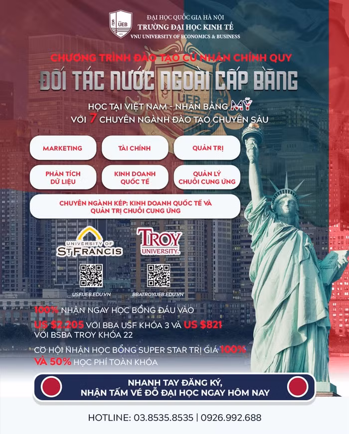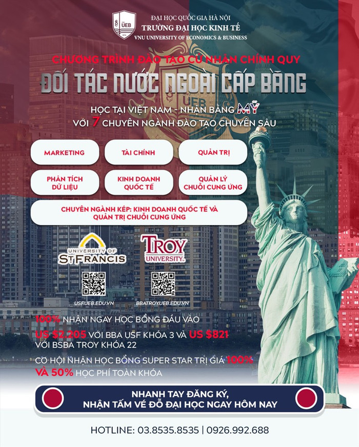 Nắm bắt những lợi thế này, tại Trường Đại học Kinh tế - Đại học Quốc gia Hà Nội hàng trăm học sinh mỗi năm đã lựa chọn theo học chương trình cử nhân quản trị kinh doanh chính quy do Đại học St Francis, Mỹ (1) và Đại học Troy, Mỹ (2) cấp bằng.