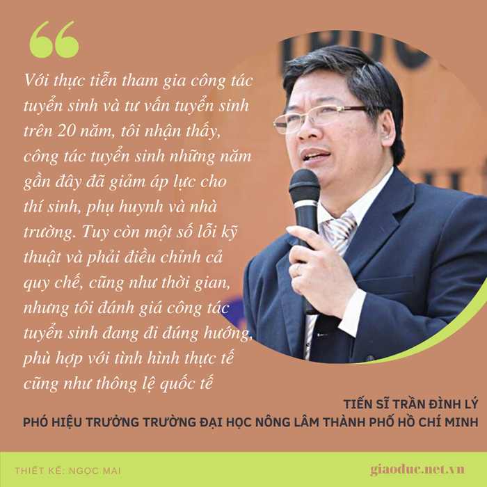 "Trong thời gian qua, với nhiều phương thức tuyển sinh, thí sinh có thể dễ dàng lựa chọn phương thức nào phù hợp nhất để có kết quả như mong muốn, đồng thời giảm tải áp lực lên các kỳ thi đối với thí sinh, phụ huynh và xã hội. Ngoài ra, các trường tùy vào điều kiện thực tế, yêu cầu đánh giá đầu vào và chương trình đào tạo để lựa chọn được thí sinh phù hợp nhất, hạn chế tình trạng trúng tuyển ngành thí sinh không phù hợp hoặc ngành đào tạo tuyển được thí sinh không phù hợp sẽ gây lãng phí cho cả thí sinh, gia đình, nhà trường và xã hội", Tiến sĩ Trần Đình Lý cho biết.