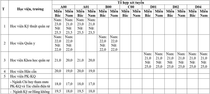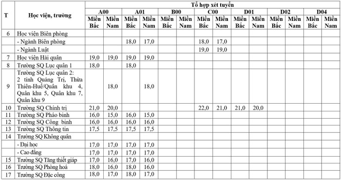 Lưu ý: Học viện Biên phòng, Trường Sĩ quan Lục quân 2 tuyển thí sinh phía Nam theo từng quân khu gồm: 2 tỉnh Quảng Trị, Thừa Thiên-Huế/Quân khu 4, Quân khu 5, Quân khu 7, Quân khu 9;