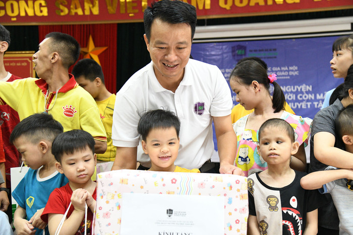 Hiệu trưởng Trường Đại học Giáo dục GS.TS. Nguyễn Quý Thanh trao quà cho các em nhỏ.
