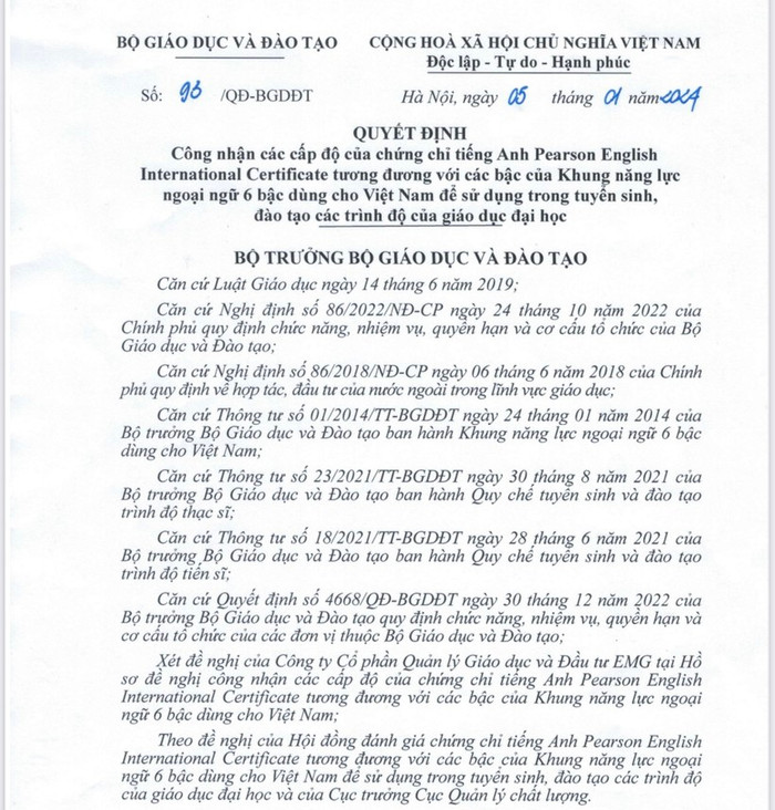 | Quyết định số 93/QĐ-BGDĐT công nhận các cấp độ của chứng chỉ tiếng Anh Pearson English International Certificate (PEIC) tương đương với các bậc của Khung năng lực ngoại ngữ 6 bậc dùng cho Việt Nam. |