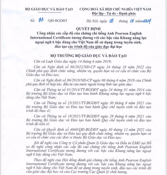 Bộ Giáo dục và Đào tạo vừa ban hành Quyết định số 93/QĐ-BGDĐT công nhận các cấp độ của chứng chỉ tiếng Anh Pearson English International Certificate (PEIC) tương đương với các bậc của Khung năng lực ngoại ngữ 6 bậc dùng cho Việt Nam để sử dụng trong tuyển sinh, đào tạo các trình độ của giáo dục đại học.