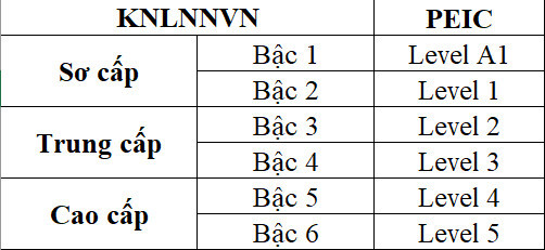 Theo đó, mức độ tương đương của chứng chỉ PEIC được công nhận như sau: