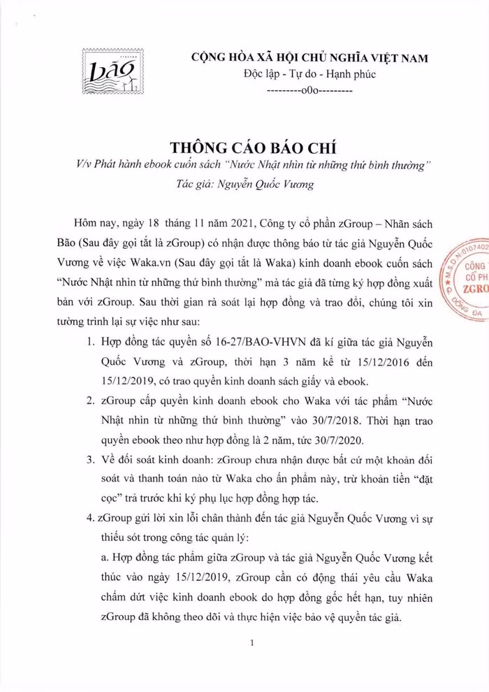 Cần phải nói thêm rằng, trong suốt thời gian hợp đồng sách giấy có hiệu lực (15/12/2016-15/12/2019) tôi không nhận được bất cứ thông báo, báo cáo hay một khoản tiền bản quyền nào từ zGroup cũng như Công ty cổ phần Waka và vì vậy không hề biết đến sách của mình đã được làm ebook.