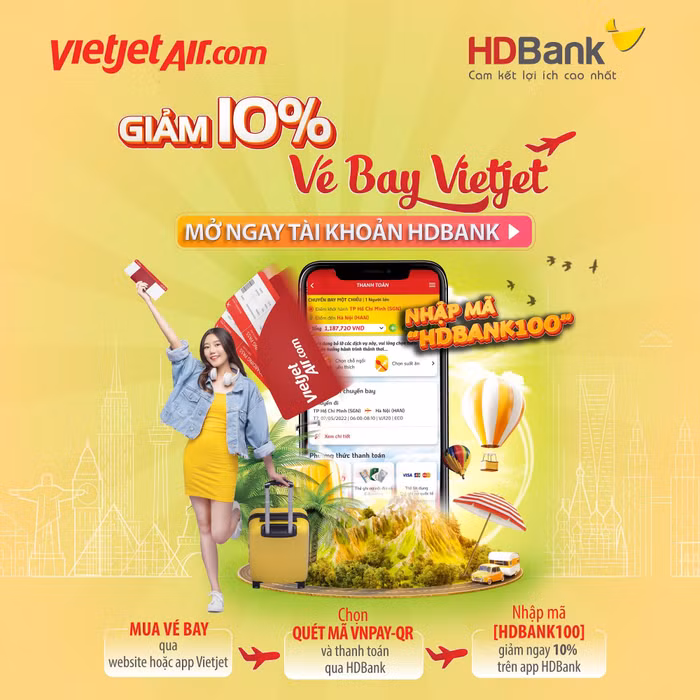 Mở tài khoản HDBank, giảm 10% vé bay Vietjet