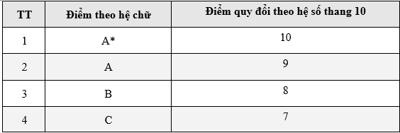 Với thí sinh xét tuyển tài năng theo chứng chỉ quốc tế, yêu cầu thí sinh cần có điểm trung bình chung các môn văn hóa từng năm học lớp 10, 11, 12 đạt từ 8,00 trở lên theo thang điểm 10; Có ít nhất 1 trong các chứng chỉ Quốc tế sau còn hiệu lực: SAT, ACT, A-Level, AP, IB. Đối với các chứng chỉ quốc tế có điểm thành phần môn học đánh giá theo hệ chữ, bảng quy đổi sang điểm số theo thang điểm 10 như sau: