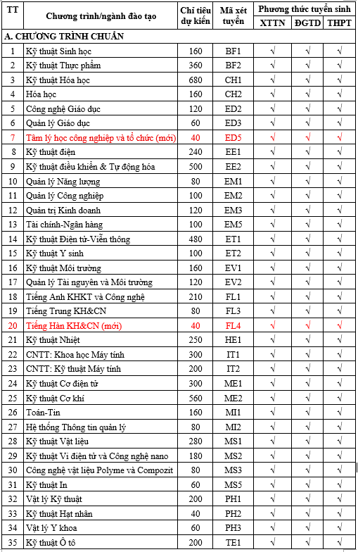Danh mục các chương trình đào tạo, chỉ tiêu, phương thức và mã xét tuyển