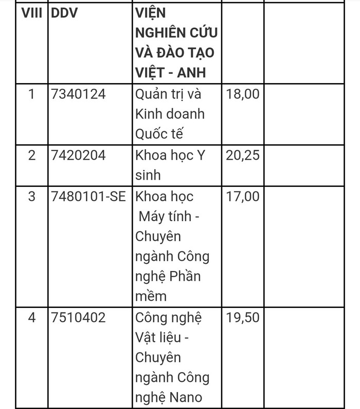 Điểm chuẩn của Viện Nghiên cứu và Đào tạo Việt - Anh: