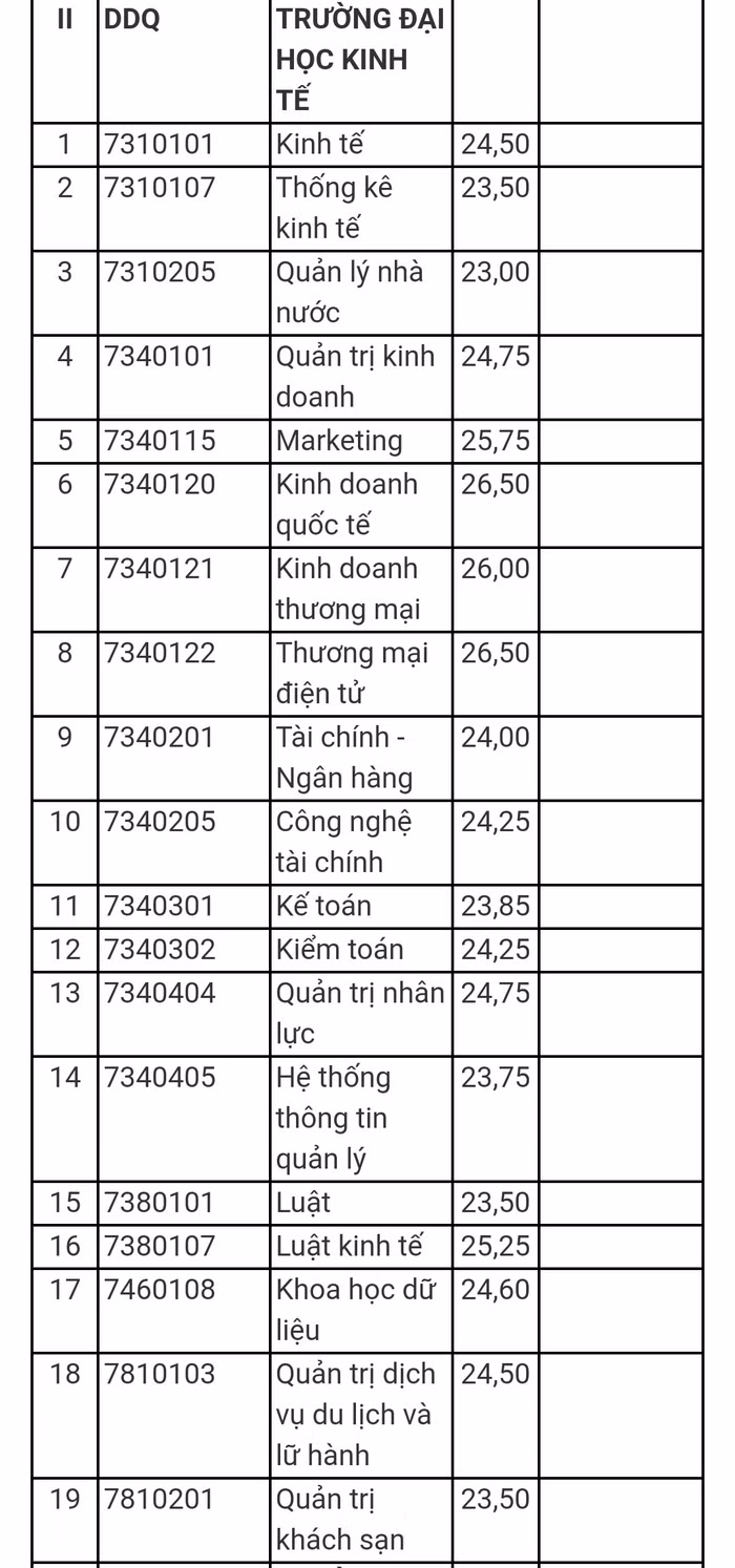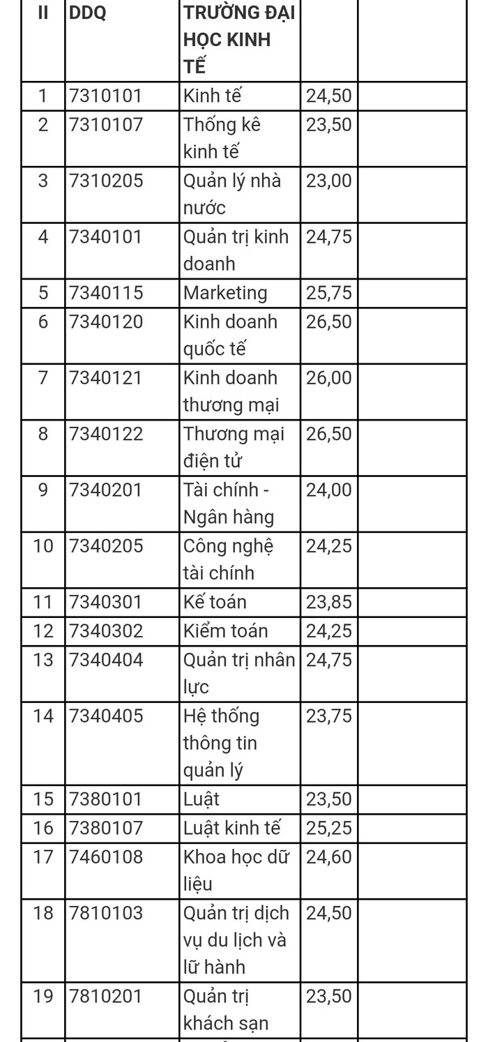 Điểm chuẩn của Trường Đại học Kinh tế như sau: