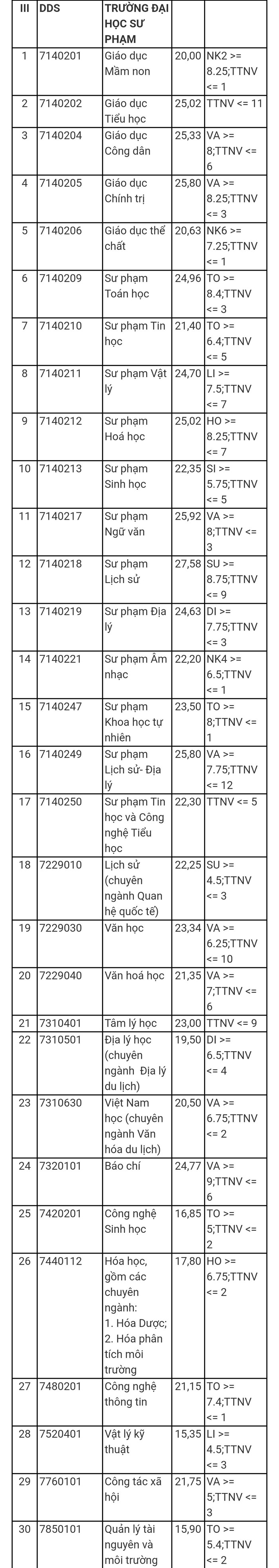 Đối với Trường Đại học Sư phạm, điểm chuẩn cao nhất là ngành Sư phạm Lịch sử là 27,58 điểm, cụ thể điểm chuẩn các ngành như sau: