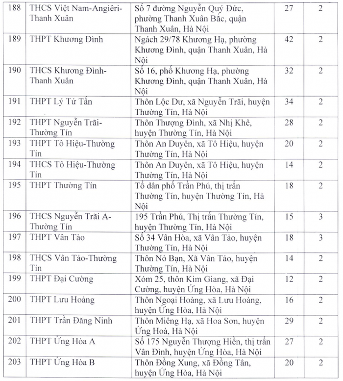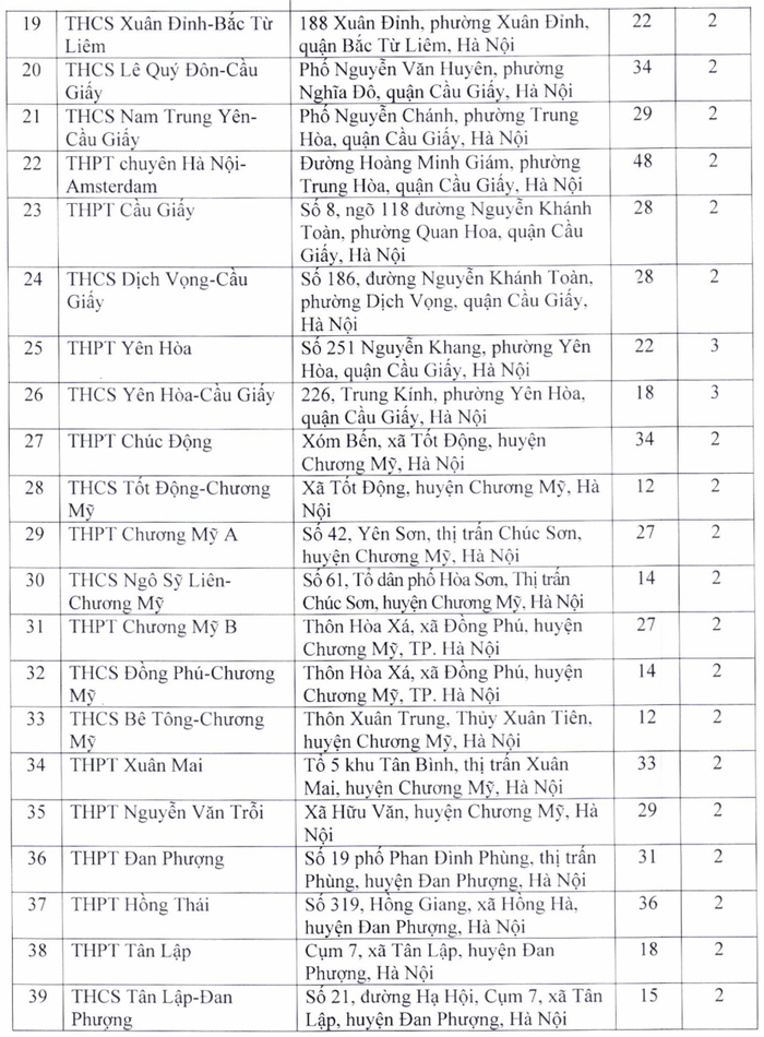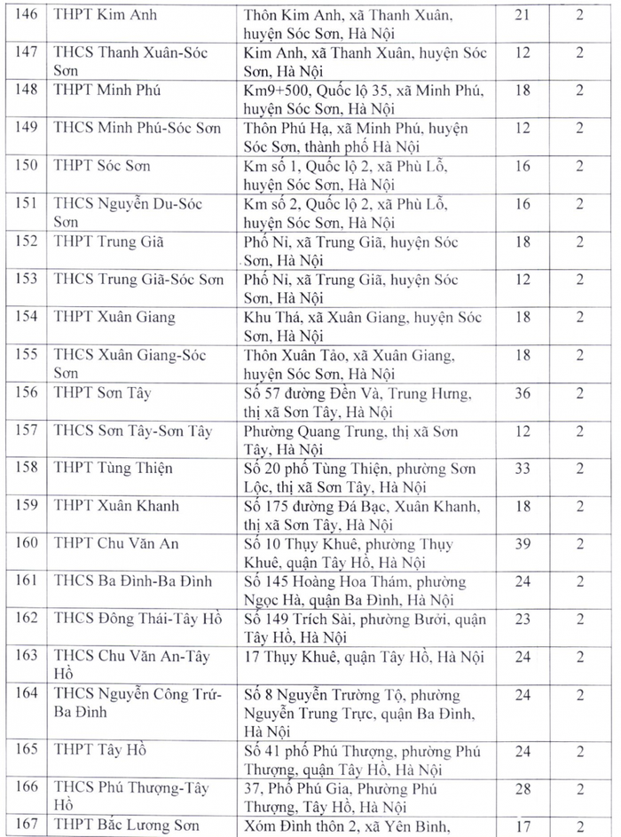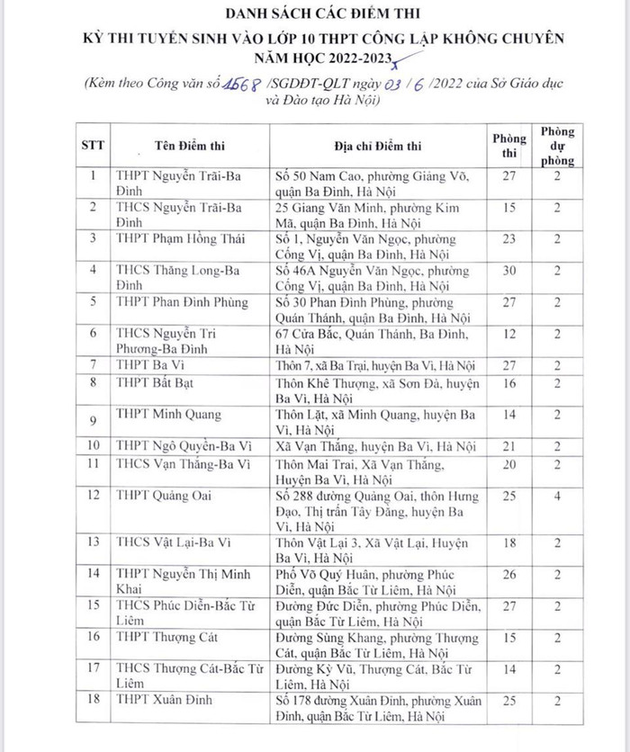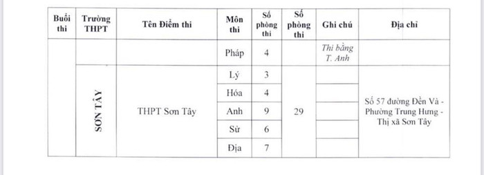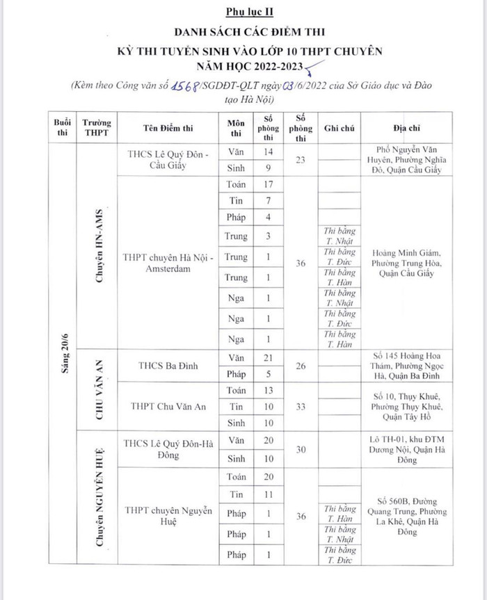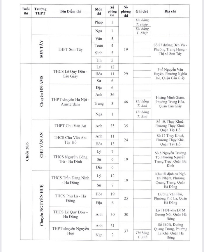 Theo đó, điểm thi có nhiều phòng thi nhất là Trường trung học phổ thông chuyên Hà Nội - Amsterdam với 48 phòng; tiếp đến là Trường trung học phổ thông chuyên Nguyễn Huệ (40 phòng), Trường trung học phổ thông Ngọc Tảo (40 phòng), Trường trung học phổ thông Chu Văn An (39 phòng), Trường trung học phổ thông Quốc Oai (38 phòng), Trường trung học phổ thông Nguyễn Du - Thanh Oai (36 phòng)...