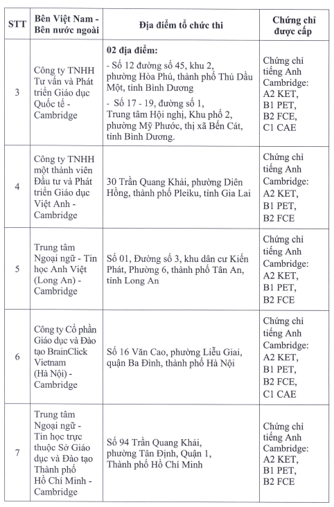 Đến ngày 7/2/2023 đã có 23 đơn vị đã được Bộ phê duyệt liên kết tổ chức thi, cấp chứng chỉ năng lực ngoại ngữ của nước ngoài.