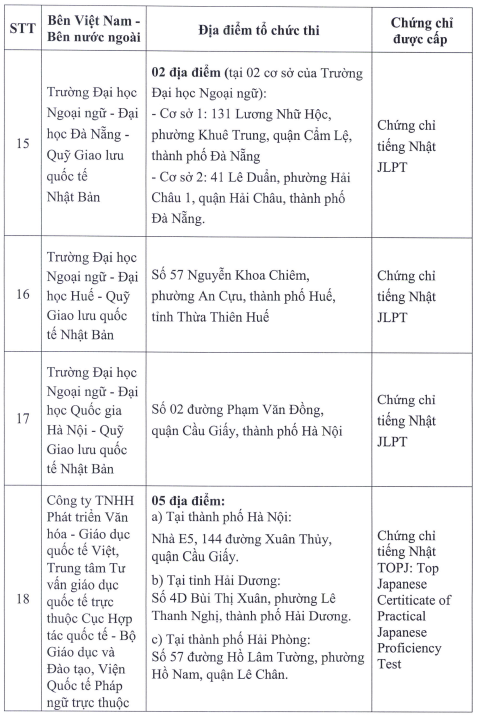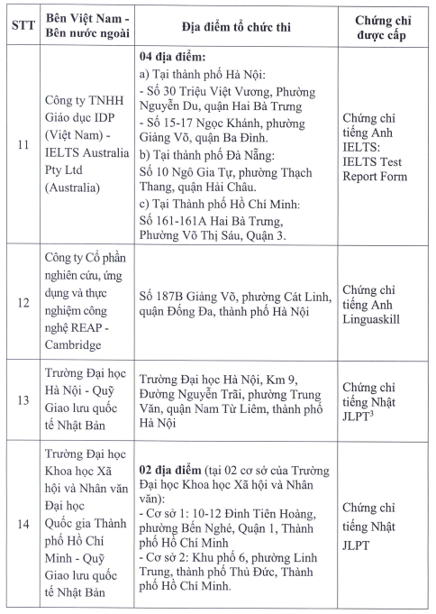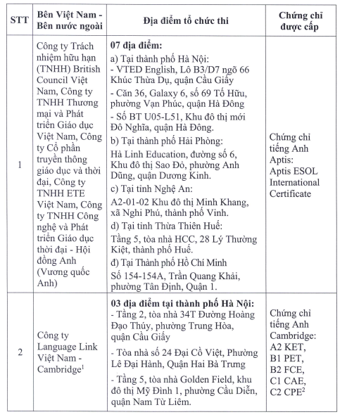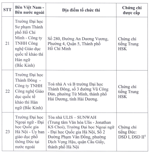 Cụ thể, danh sách 23 đơn vị được liên kết thi, cấp chứng chỉ năng lực ngoại ngữ như sau: