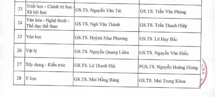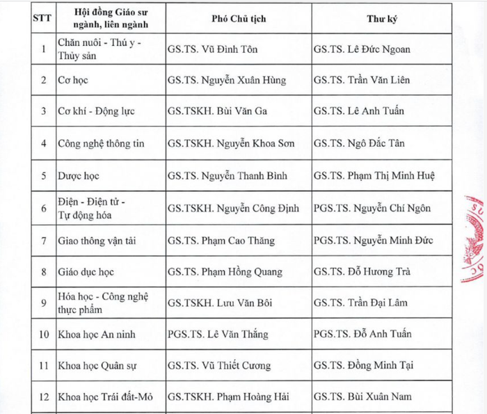 Theo đó, danh sách Phó Chủ tịch, Thư ký của 28 Hội đồng Giáo sư ngành/liên ngành cụ thể như sau: