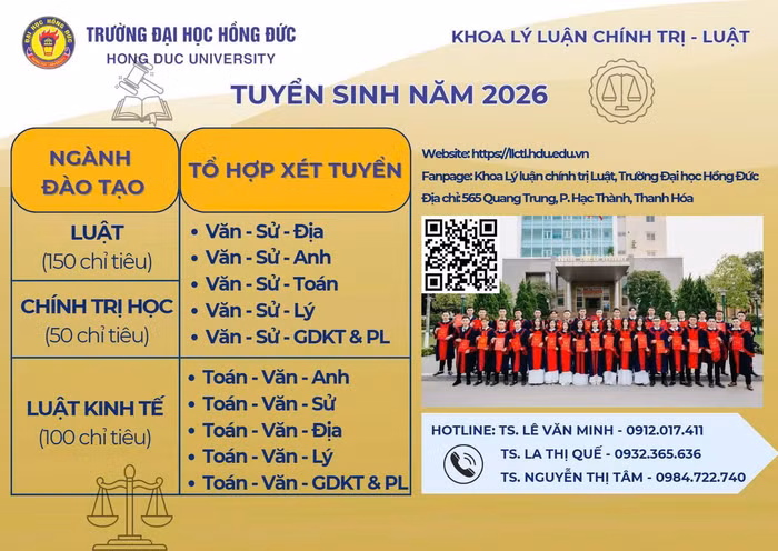 Theo thông tin tuyển sinh, ngành Cử nhân Luật, Khoa Lý luận Chính trị - Luật, Trường Đại học Hồng Đức sử dụng các tổ hợp xét tuyển gồm: Văn - Sử - Địa; Văn - Sử - Anh; Văn - Sử - Toán; Văn - Sử - Lý; Văn - Sử - Giáo dục kinh tế và pháp luật.