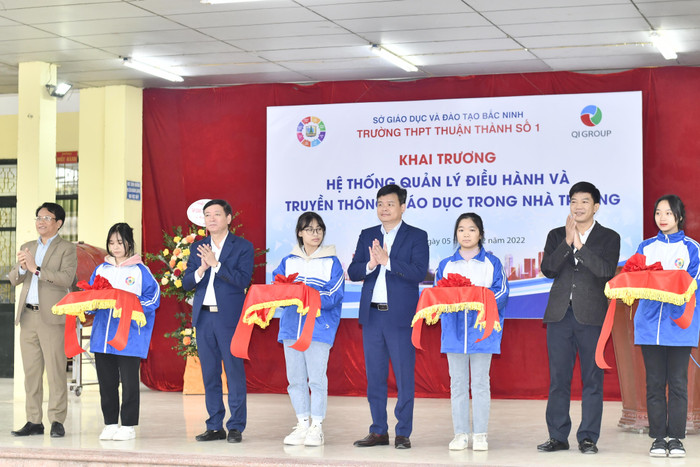 | Lãnh đạo Sở Giáo dục và Đào tạo tỉnh Bắc Ninh, Hiệu trưởng Trường Trung học phổ thông Thuận Thành số 1 cùng Tổng Giám đốc Công ty cổ phần Tập đoàn Quảng Ích cắt băng khánh thành Khai trương Hệ thống quản lý điều hành và truyền thông giáo dục trong nhà trường. (Ảnh: Mai Huệ). |