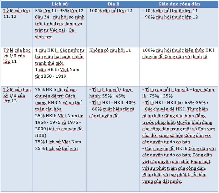 Mỗi môn thi thành phần Địa lí; Lịch sử và Giáo dục công dân vẫn bao gồm 40 câu hỏi với thời gian làm bài 50 phút và tuân thủ đúng cấu trúc nội dung như Bộ Giáo dục và Đào tạo đã công bố. Có thể quan sát bảng số liệu thống kê sau: