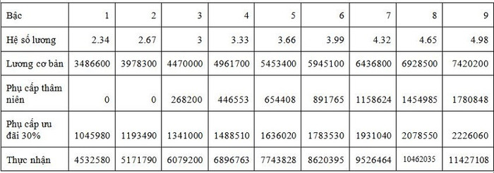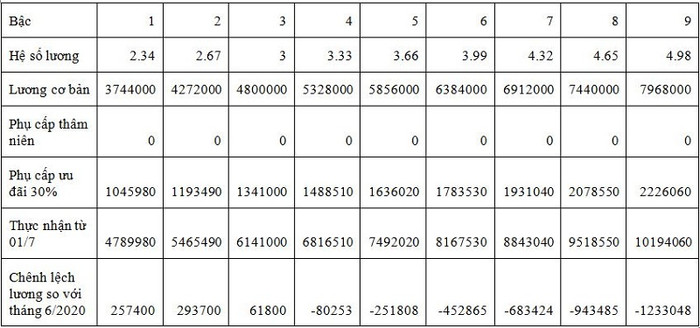 Giả sử từ 01/7/2020, nếu chưa xây dựng bảng lương riêng cho giáo viên thì lương của một số ít giáo viên mới ra trường (chưa được hưởng phụ cấp thâm niên) có tăng, còn đa số giáo viên còn lại chắc chắn sẽ có giảm theo bảng tham khảo sau:
