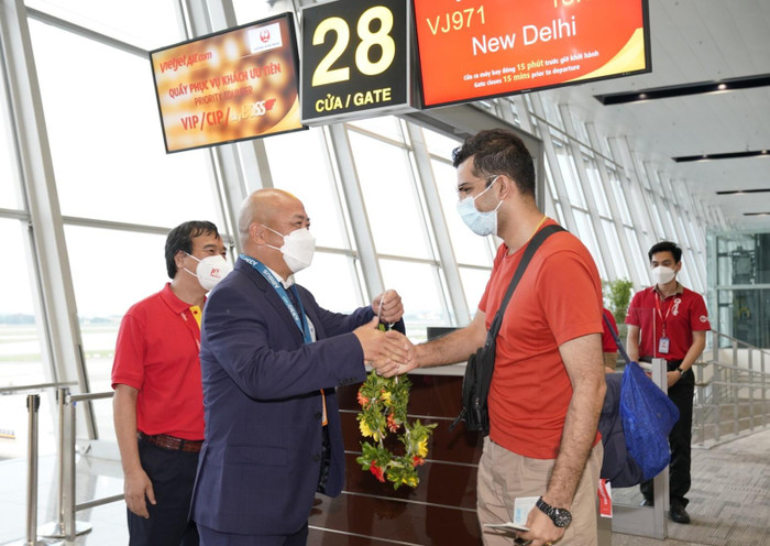 Chào đón những hành khách đầu tiên trở lại với đường bay tới Ấn Độ, lãnh đạo Cục Hàng không và Vietjet đã có mặt tại sân bay, tặng hoa và những lời chúc tốt đẹp trước hành trình.