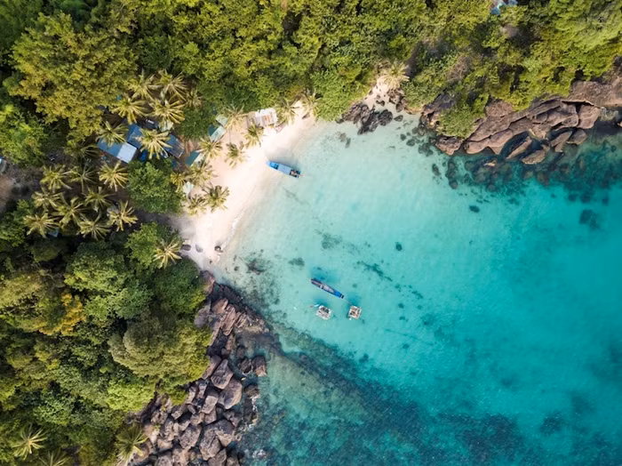 Bức tranh Nam Phú Quốc được sắp đặt diệu kỳ với những mảng màu sống động: xanh lam của trời, xanh ngọc bích của biển, xanh rì của những cánh rừng già và những làn cát trắng mịn như kem.