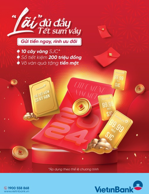 Từ 1/12/2023, khi gửi tiền tại VietinBank, khách hàng không chỉ được nhận quà tặng bằng tiền ngay tại thời điểm giao dịch mà còn có cơ hội sở hữu giải thưởng lên tới 10 cây vàng SJC.
