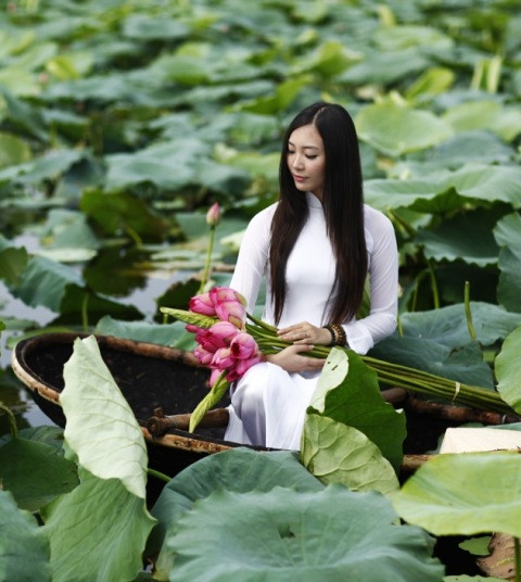 | Á hậu Thùy Trang đẹp dịu dàng bên hoa sen và tà áo dài truyền thống. |
