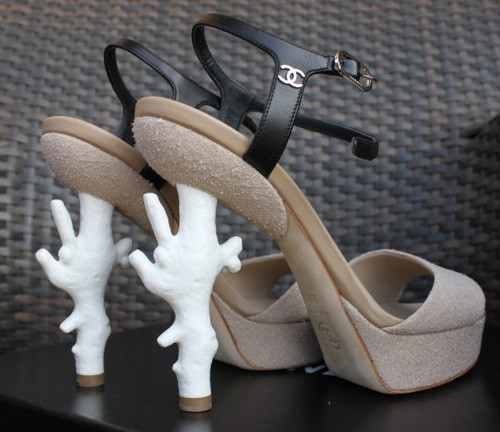 | Ngôi sao thời trang Phạm Băng Băng xinh tươi trên đôi sandal cao gót với đế biến tấu hình nhánh san hô rất xinh xắn của Chanel. |