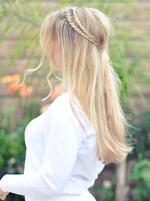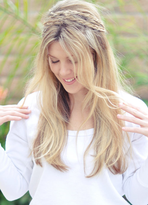| Vẫn với mái tóc buông xõa, bạn tạo 4 dây sam tết đều nhau sau đó quấn thành hình tròn trên đỉnh đầu (giống như băng đô nhỏ) trang trí cho mái tóc thêm điệu đà. |
