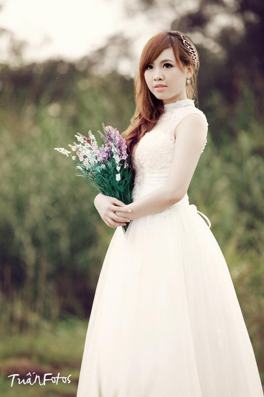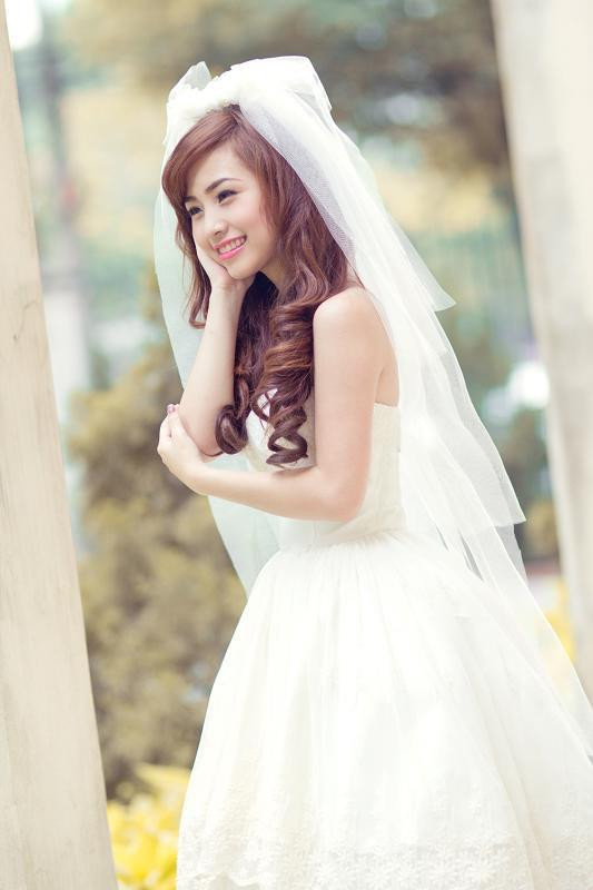 | Với kiểu tóc mái ma nơ canh, chiếc nơ cài đầu trắng duyên dáng làm toát lên vẻ đẹp trong sáng và trẻ trung. Hot girl Trinh Nguyễn cũng là một trong những cô nàng tuổi teen diện váy cưới cực xinh khiến bao người phải ngỡ ngàng. |